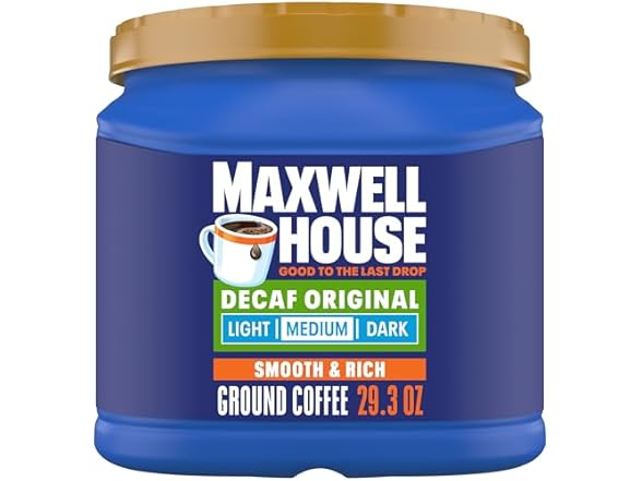 - MAXWELL HOUSE COFFEE: One 29.3 oz canister of Maxwell House Original Medium Roast Decaf Ground Coffee