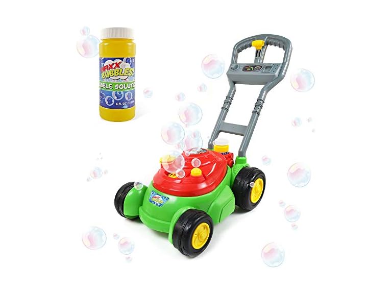 - PUSH BUBBLE TOY: Just push the mower and have fun with bubbles in seconds! No batteries required. As the mower is pushed, it releases tons of incredible bubbles into the air.