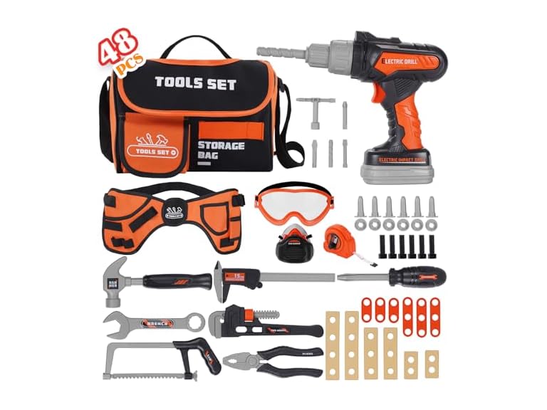 - 【2025 Upgraded Super Value 48-Piece Tool Kit】This complete pretend tool set includes all sizes and all kinds of tool for kids, which contains everything you need. It comes with 48 realistic and functional pieces including tool bag, electric drill, realistic-looking hammer, tool belt, tape measure, goggle, mask, hand saw, vise, screwdrivers and wrenches toys as well as a variety of wood chips, nails, nuts and more! Children will be busy playing tools like mom and dad to keep them engaged for hour.