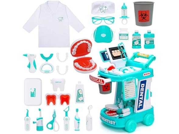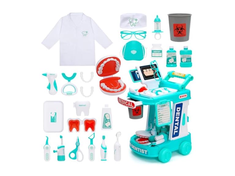 - 【Learning Through Play】Toddlers can wear doctor uniform & imagine to role play as a dentist, nurse, or even veterinarian for doctor games through a wheeled medical station to do dental check-up for family members, friends, pets that learn about ‘decay’ in a playful way. Dentist kit for kids is a great exercise for practicing social skills and enhancing language development. It’s perfect for 3 years old girls or younger to reduce fear of doctor's visits by showing what will happen using the appropriate play instrument, making it not so scary