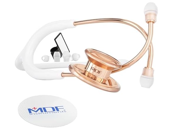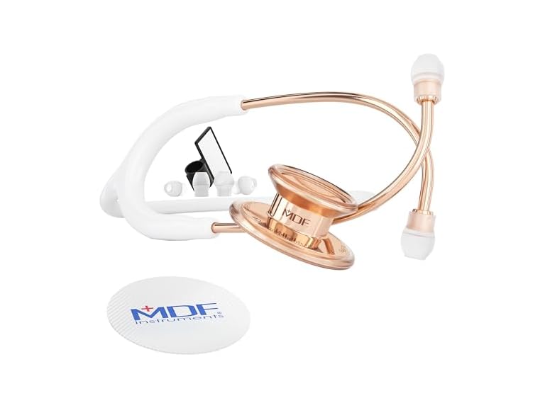 - MDF Instruments, RoseGold MD One Stainless Steel Stethoscope, Adult, White Tube, RoseGold Chestpieces-Headset, MDF777RG29