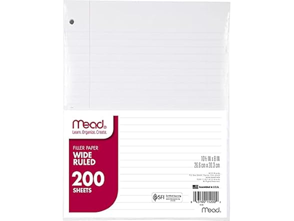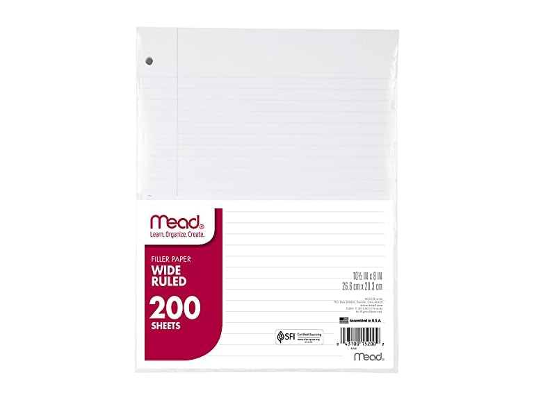 - (1) Mead Loose Leaf Paper, Wide Ruled, 200 Sheets, Standard 10-1/2" x 8", Lined Filler Paper, 3 Hole Punched for 3 Ring Binder, Writing & Office Paper, College, K-12 or Homeschool, 1 Pack (15200) , White