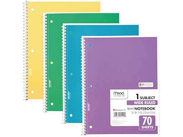 - (1) Mead Spiral Notebooks, 4 Pack, 1-Subject, Wide Ruled Paper, 10-1/2" x 8", 70 Sheets per Notebook, Colors Will Vary (72873)