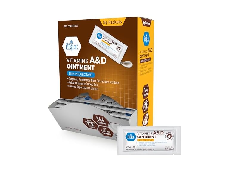 - (1) MED PRIDE Vitamins A&D Ointment Packets for Skin Relief -Vitamin A & D Skin Protectant Ointment, 5g Packets, 144-Count, for Body Chaffing, Diaper Rash, Cuts, Dry-Cracked Hands/Feet/Face