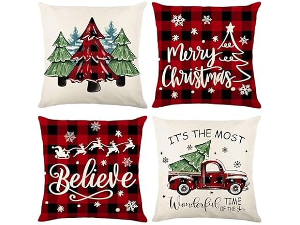 - (1) Meifannao Christmas Pillow Covers 18x18 Inch Set of 4, Red Merry Christmas Believe Xmas Tree Holiday Cushion Case Christmas Decorations for Sofa Couch
