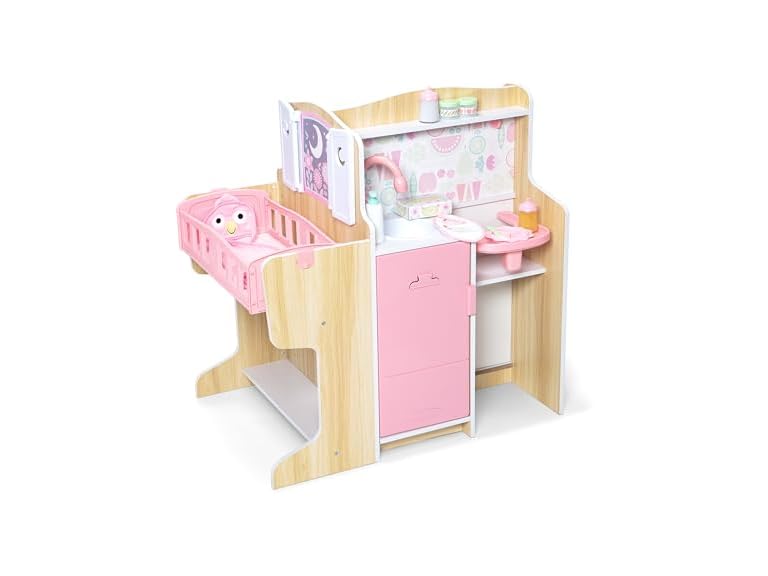 - Everything kids need to nurture and play with their dolls and stuffed animals: Wooden multi-functional doll and stuffed animal baby care center with kitchen, bathing and changing area, and nursery; feeding, diaper-changing, and bathing accessories
