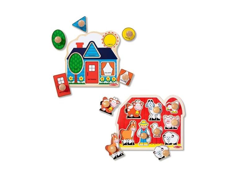 - (1) Melissa & Doug Wooden Jumbo Knob Puzzle 2-Pack for Baby and Toddler Boys and Girls – Large Farm, First Shapes