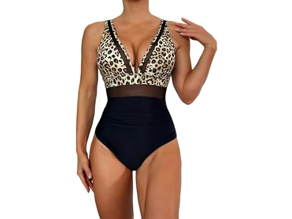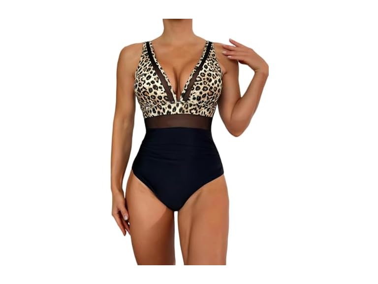 - (1) Memashore One Piece Bathing Suit Women Mesh Slimming Tummy Control Monokini Sexy High Leg Cut Swim Ruched Full Coverage Longline Teen Girls Cheeky Leopard Print Black S