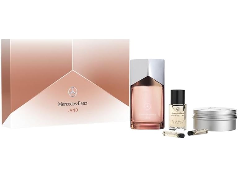 - Men's Cologne Gift Set: The Mercedes-Benz Land LSA Giftset includes a 3.4 oz Land EDP mens cologne spray, 1 oz hair and beard oil, 0.05 oz Sea EDP, 0.05 oz Air EDP, and a solid shower gel for a complete personal care experience.