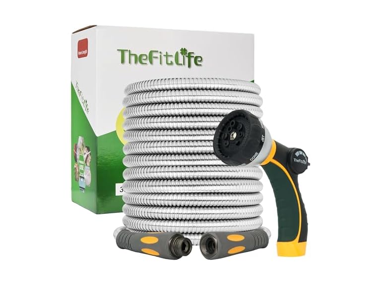 - 100% Satisfaction: You can use it for gardening, watering, cleaning, washing, pet bathing and also use with sprinkler, house pool, RV and so on. The hoses can be connected to get longer, you can use the desired size to gardening and don’t worry about the length may not reach. Our stainless steel garden hose can be used in all weather conditions. You can also easily store and maneuver it. Just feel confident with this purchase and the hose is backed by TheFitLife with one-year warranty.