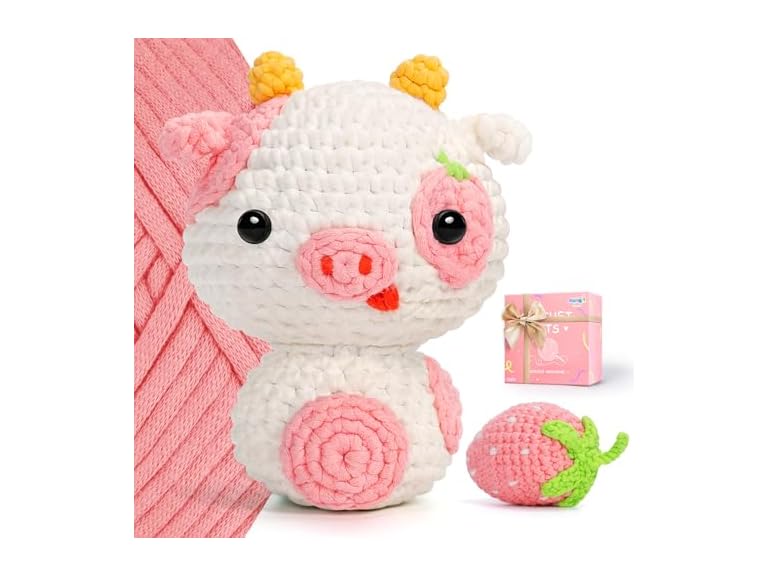 - (1) Mewaii Crochet Kit for Beginners, Crochet Animal Kit with Step-by-Step Video Tutorial, Learn to Crochet Starter Kit with 40%+ Tape Yarn, DIY Crochet Gifts for Kids Adults (Strawberry Cow)