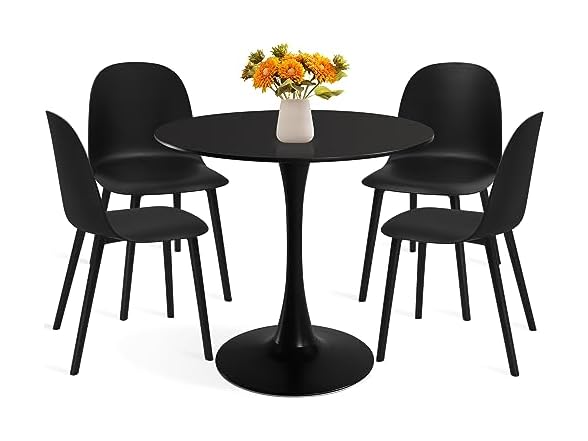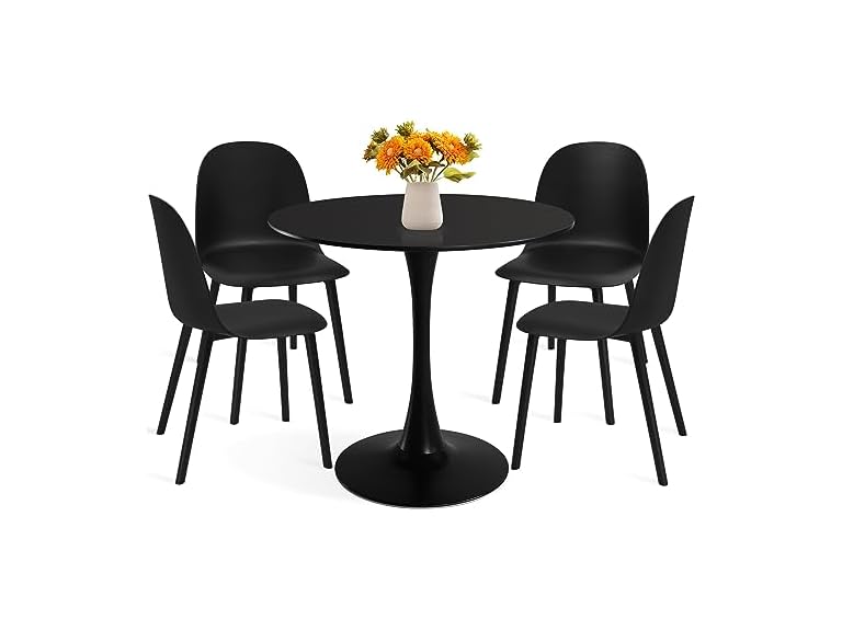 - 5-Piece Dining Table Set: Round table and four dining chairs with a sleek and sophisticated design, accommodating up to four individuals. Chairs made of premium injection molded polypropylene, providing a modern and natural feel. Table features an MDF tabletop and metal base, adding durability and style to your home decor.