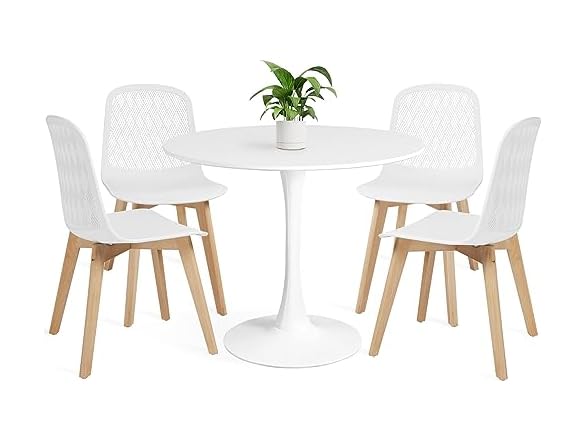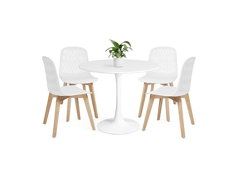 - 5-Piece Dining Table Set: Round table and four dining chairs with a sleek and sophisticated design, accommodating up to four individuals. Chairs made of premium injection molded polypropylene with solid wood legs, providing a modern and natural feel. Table features an MDF tabletop and metal base, adding durability and style to your home decor.
