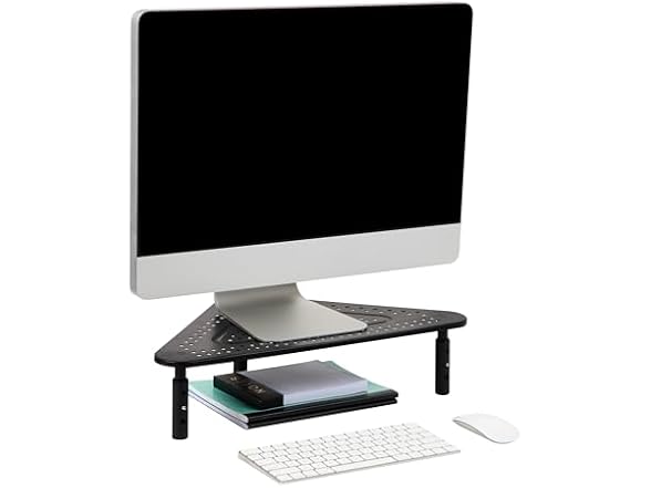 - (1) Mind Reader Triangle Monitor Stand, 40lb(18kg) Capacity, Adjustable Height, Ventilated, Metal, 19.5"L x 14.5"W x 5.5"H, Black