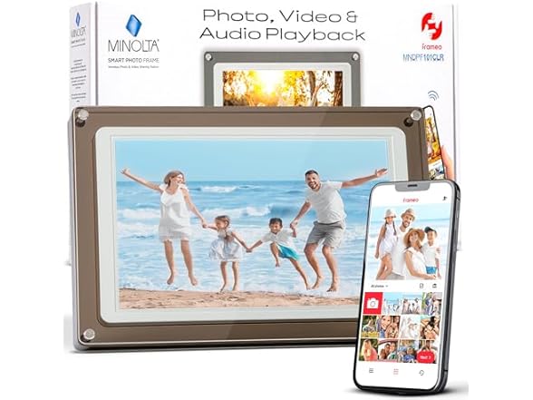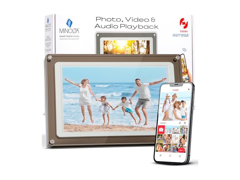 - (1) Minolta Smart Photo Frame 10.1 inch - Digital Picture Frame with IPS Touch Screen HD Display, Built-in Free Frameo App and WiFi, 16GB Storage, Translucent Acrylic Design (White/Smoke)