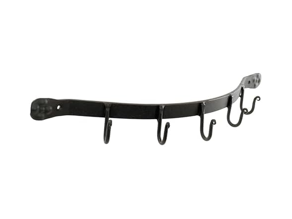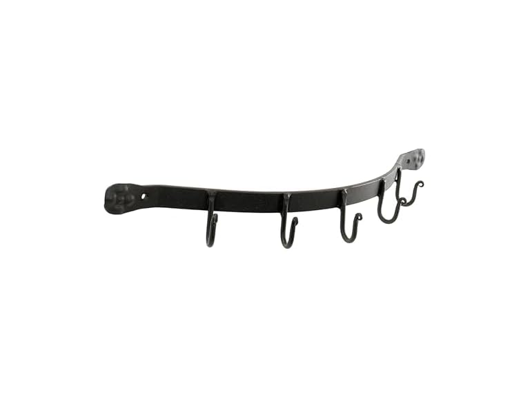 - Made of wrought iron with traditional forging techniques, the narrow hooks have curled tips, flower detail