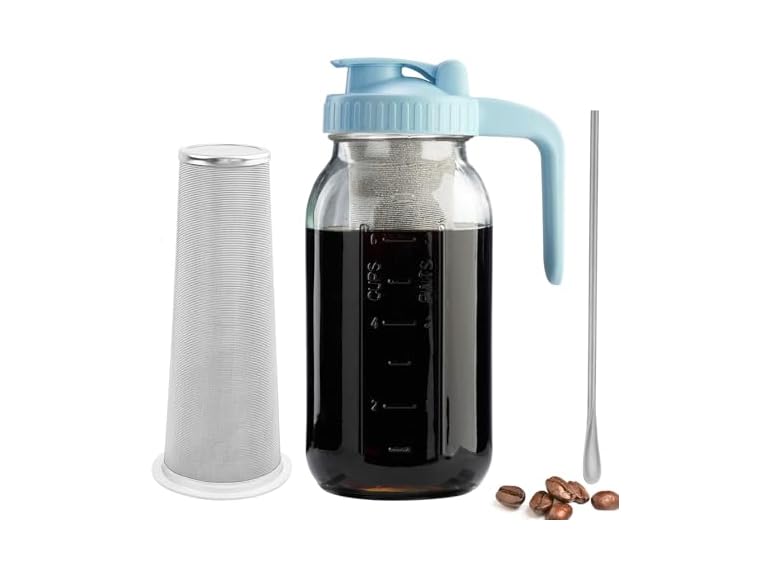 - (1) Cold Brew Coffee Maker with V-shaped Lid, 64oz Cold Brew Pitcher with Stainless Steel Filter, BPA Free Sturdy Mason Jar Cold Brew Maker for Coffee, Iced Tea, Sun Tea, Lemonade