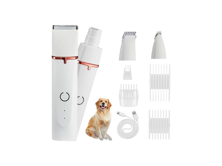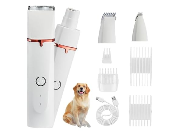 - Perfect dog grooming kit: The pet clipper kit contains dog pliers*1 piece, hair pruning head*1 piece, physical detail prunter head*1 piece, claw trimmer head*1 piece, nail grinding head*1, limited combing*4 pieces, Clean 1 piece, USB line*1 piece.