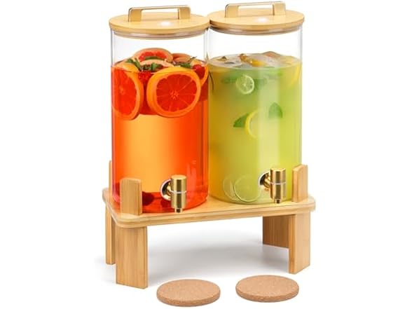 - 【Including Accessories】 This drink dispenser set includes 2pcs large 1.5-gallon pitcher, 1 wood stand, 2 gold colored stainless steel faucets , 2 bamboo cover with airtight valve, 2 cork coasters, 4 anti-slip strips for stand legs, 12 round clear silicone gaskets, 1 wrench, and 1 installation instruction.