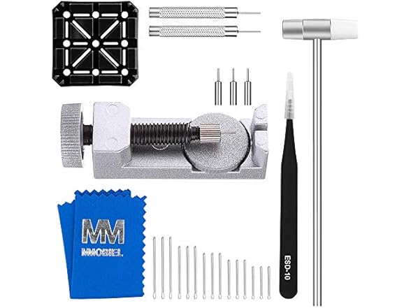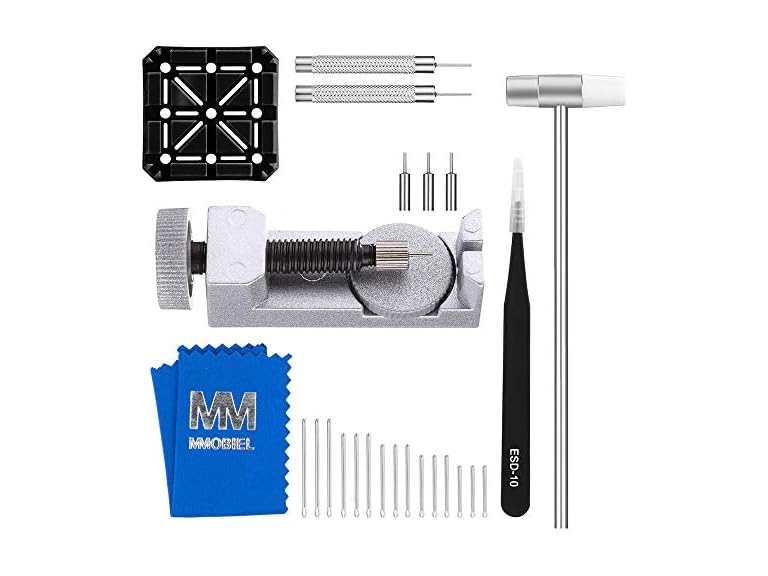 - Package MMOBIEL Watch band Strap Link Pin tool kit Includes a watch band link pin remover with 3 x extra tips, 1 x plastic watch holder, 1 x dual head hammer, 2 x pin punches, 15 pieces cotter pins, 1 x Tweezers and 1 x Cleaning Cloth.