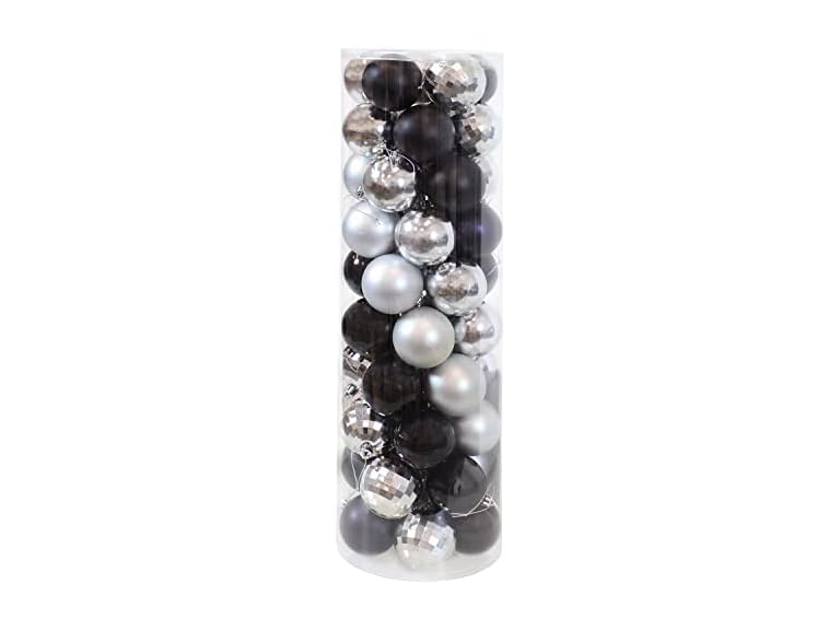 - Set of 50 ball ornaments: This package includes 10 matte black, 10 mirrored silver, 10 matte silver, 10 shiny black, and 10 shiny silver ornaments.