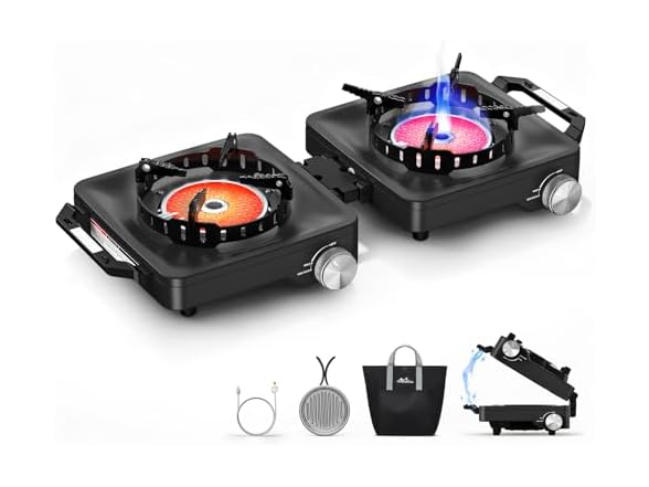 - 𝗨𝗽𝗴𝗿𝗮𝗱𝗲𝗱 𝗠𝗲𝘁𝗮𝗹 𝗞𝗻𝗼𝗯𝘀 & 𝗖𝗲𝗿𝗮𝗺𝗶𝗰 𝗜𝗴𝗻𝗶𝘁𝗶𝗼𝗻 (𝗪𝗢𝗡'𝗧 𝗠𝗘𝗟𝗧) : We replaced plastic components with High-Heat Resistant Metal Knobs and a durable ceramic ignition needle (Piezo for 10,000+ strikes) to eliminate the common issue of melting parts.This ensures safe, reliable startups every time and extends the stove's lifespan, making it a dependable choice for emergency backup or RV trips outdoor camping use.