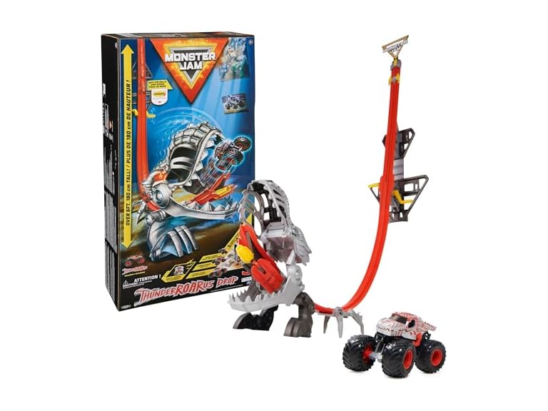 - (1) Monster Jam ThunderROARus Drop Playset with Exclusive Monster Truck, Over 6 Feet Tall, Lights & Sounds, Kids Dinosaur Toys for Boys and Girls Ages 4 and Up