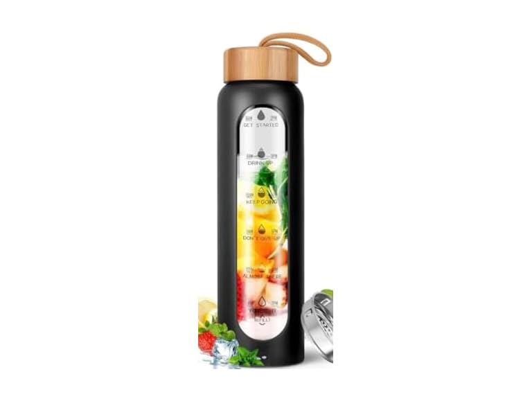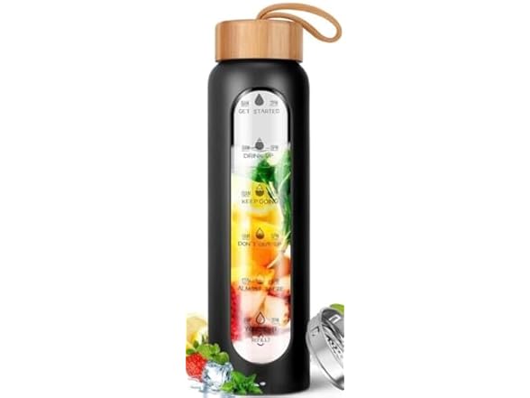 - (1) Generic 32 Oz Motivational Borosilicate Glass Water Bottle with bamboo lid and silicone sleeve (Black)