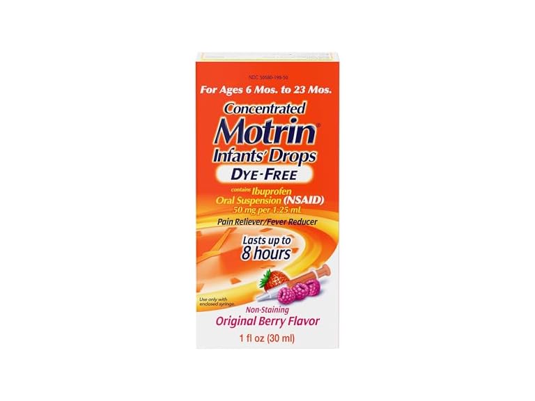 - 1-fluid ounce of Infants' Motrin Oral Suspension Liquid Medicine Drops with Ibuprofen in a berry flavor to help temporarily reduce fever and relieve pain in babies and infants