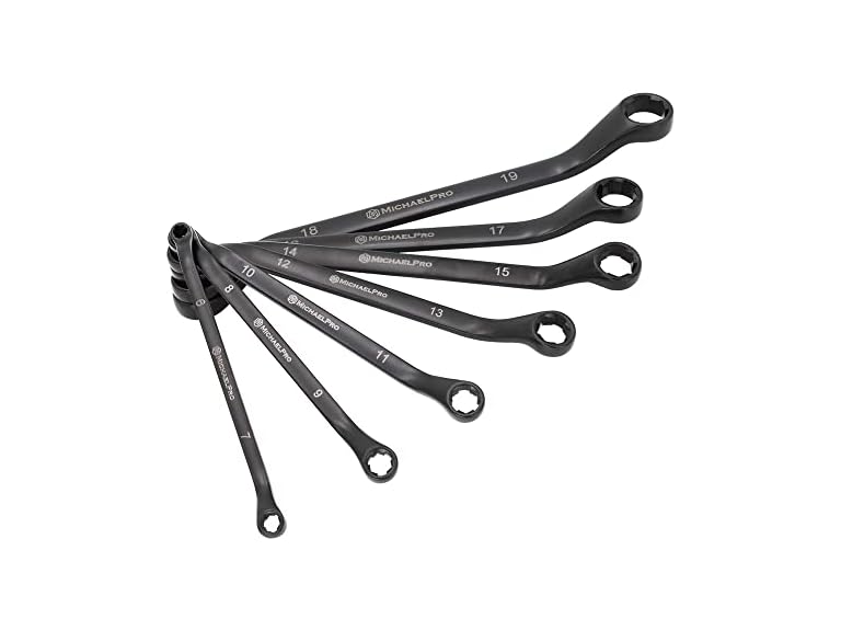 - (1) MichaelPro MP001217 7-Piece Bolt Extractor Wrench Set, 45° Offset Wrenches Metric 6-19mm, 6-Point Box End Nut for Rounded, Stripped and Thin Bolts Removal, CR-V Steel, Storage Tray is Include