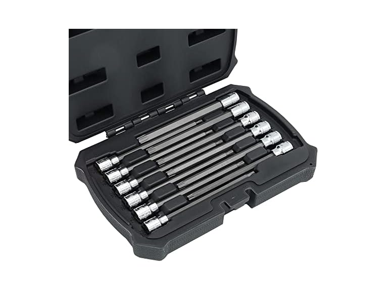 - 【LONG TORX SOCKET SET】This set includes: 12 PCS of 3/8'' drive long star bit sockets. Bit Socket Length: 6 inches. It comes in a sturdy, portable, impact-resistnt case and includes the most common sizes: T10, T15, T20, T25, T27, T30, T40, T45, T47, T50, T55, and T60.