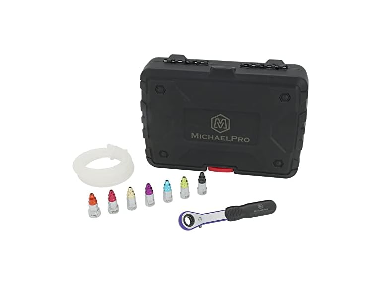 - (1) MichaelPro MP019003 Mechanic’s Brake Bleeder Wrench Set with 7mm to 12mm & 3/8-Inch 12-Point Socket, 47-Inch Length Oil Drain Hose Included