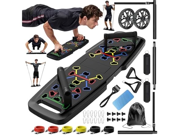 - 【Fitness System for Anyone】 Versatile home portable fitness device, We've kept the professional push up straining, Added foldable fitness bars and wrist/ankle straps, Ab roller wheel and 6 resistance bands so You can perform more exercises. Light but stable enough. You can choose the intensity according to your ability.