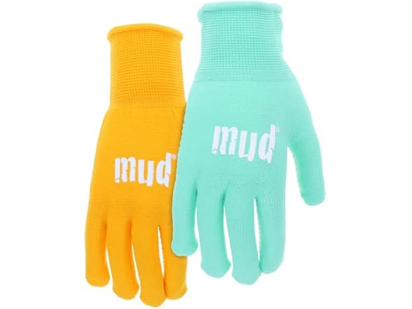 Introducing the Everyday MUD Gardening Gloves for Women by MUD! This 2-pack offers both style and functionality, with one pair in refreshing mint color and another in vibrant saffron. Designed specifically for women who love gardening, these gloves are a perfect blend of fashion and practicality. Experience superior grip with the dotted palm design. Keep your hands cool and comfortable with the nylon knit back. The breathable material allows air circulation, preventing sweaty hands and ensuring a pleasant gardening experience even during warm weather. Designed to reduce hand fatigue, these gloves are lightweight and perfect for extended gardening sessions. Enjoy the freedom to work longer without discomfort, thanks to their ergonomic design. The form fitting nature of these gloves ensures a snug and secure fit, allowing optimal dexterity and flexibility. They contour to the shape of your hands, providing excellent control and precision for intricate gardening tasks. With their dotted palm, breathable nylon knit back, lightweight design, and form fitting construction, these gloves are a must-have accessory for any gardener.