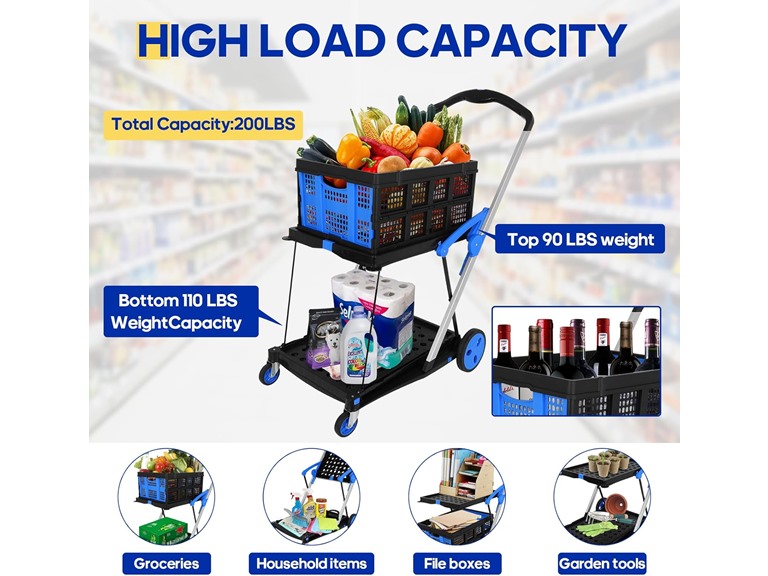 - 📦LARGE CAPACITY & TWO COLPASIBLE BASKETS📦 -- The Multi-functional Foldable Cart with planty space can hold up to 200 pounds of cargo.The design of two layers space allows you to better categorize items.This Collapsible Utility Cart has two separate foldable baskets,esuring you can transporte a large number of small parcels or some hammers, flower pots,or collapse them when you don't need