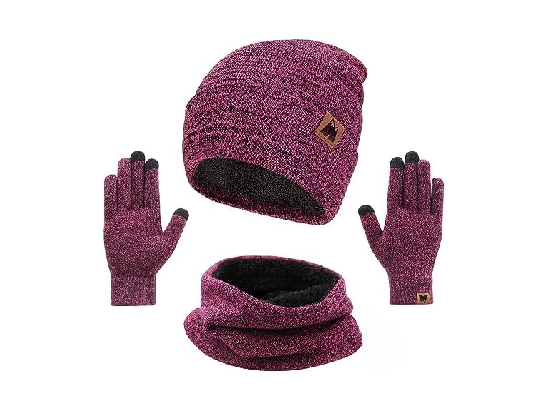 (1) Mysuntown Beanie Hat Scarf Gloves Set Rose Red