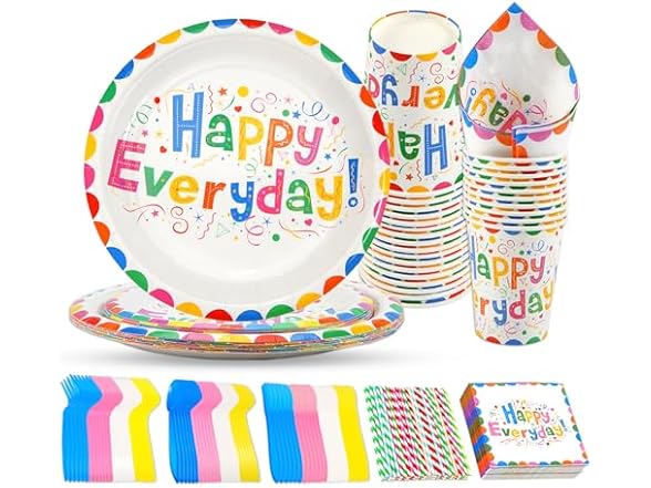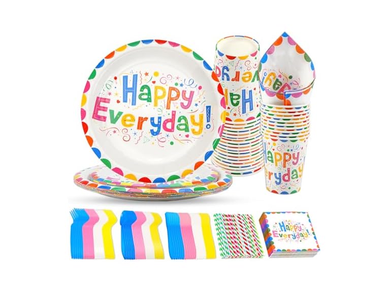 - 160 PIECES HAPPY BIRTHDAY TABLEWARE SET, safe and practical decoration. Perfect for 20 guests. You will receive a Set of Party disposable tableware . Package contains: 20 9“ paper plates, 20 7” paper plates, 20 9 oz paper cups, 20 6.5” paper napkins,20 knives,20 Forks,20 Spoons ,20 Paper straws.