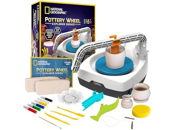 With the National Geographic Explorer Series Pottery Wheel Set, kids and beginners can experience the creative thrill of designing, throwing, and painting their own air-dry pottery! With its AC-powered wheel, innovative features and loads of pottery-making accessories, this STEAM kit is designed to introduce kids to pottery making while eliminating frustration and setting them up for success from the start! This STEAM pottery wheel set includes everything kids and beginners need to start creating: pottery wheel with plug-in electric motor; 2 lbs. of air-dry clay; innovative arm tool with Centering, Opening & Shaping attachments; apron; 3 sculpting tools; wire tool; sponge; 6 colors of paint; paintbrush; palette; and detailed Learning Guide with kid-friendly instructions and video lessons. While battery-powered units can often slow or skip from downward pressure, the National Geographic Explorer Series Pottery Wheel boasts a 2-speed, AC-powered motor that won't become sluggish as kids work with clay. To make pottery even more fun, the wheel's design includes an integrated arm tool with three attachments to open, center and shape clay into art. No baking or firing is necessary, and once dry, kids can use the included sculpting tools, paints, palette and brush to add more artistic flair to their creations! Detailed, kid-friendly instructions are also included, along with links to step-by-step video lessons that guide kids through the process of pottery making. National Geographic also includes an illustrated Learning Guide that teaches kids about clay, the physics of making pottery, and how cultures from around the world have used both throughout the ages. Order the National Geographic Explorer Series Pottery Wheel Kit today and give your kids a hands-on introduction to the artistic world of pottery making! We make the highest quality hands-on science toys, and all products are backed by exceptional service. With a mission to inspire people to care about the planet, the National Geographic Society is one of the world's largest nonprofit scientific and educational organizations.