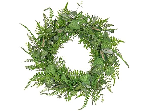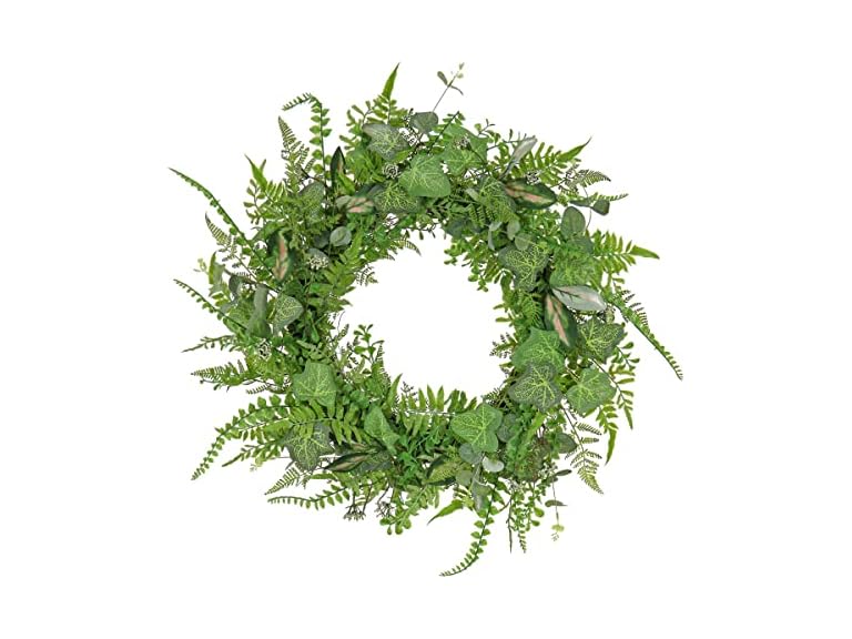 - This artificial hanging wreath is decorated with an assortment of delicate fern fronds and features a swirl of assorted long, leafy greens to create an additional natural appeal