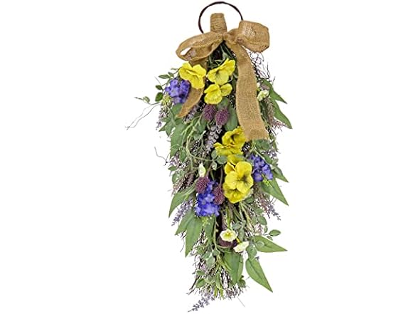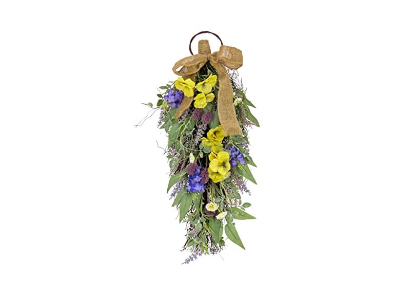 - This artificial teardrop wall hanging decoration is decorated with pansy blooms, lavender, assorted blossoms and flowing green stems