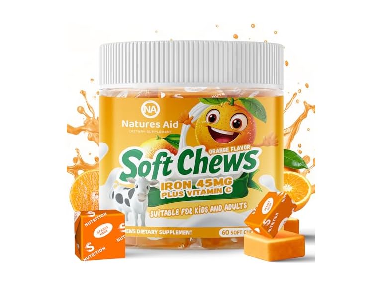 - (1) Natures Aid Chewable Iron Supplement for Women & Men and Kids - Orange Flavor, Iron Vitamin C Soft Chew for Max Absorption, Iron as Ferrous Fumarate, Ideal for Iron Deficiency, 2 Month Supply