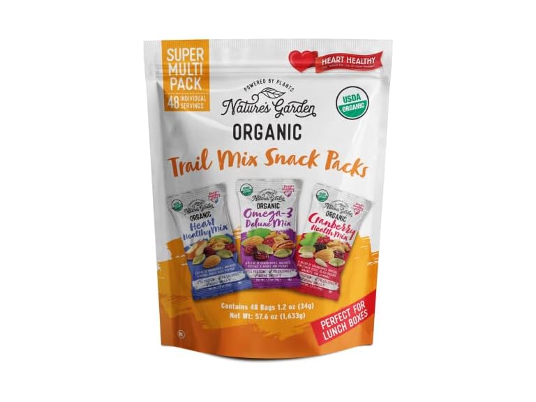 - Nature's Garden Organic Trail Mix Snack Packs - Trail Mix Variety, Energy Boosting, Heart Healthy, Omega-3 Rich, Cranberries, Pumpkin Seeds, Individual Packs, Family - 1.2 Oz Bags (48 Individual Servings)