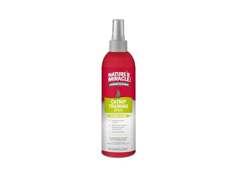 - (1) Natures Miracle Advanced Catnip Training Spray with Real Catnip Oil Attracts Cats and Encourages Positive Behavior, 8 Ounces