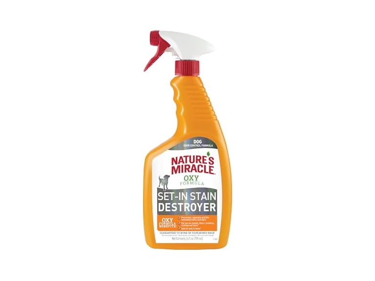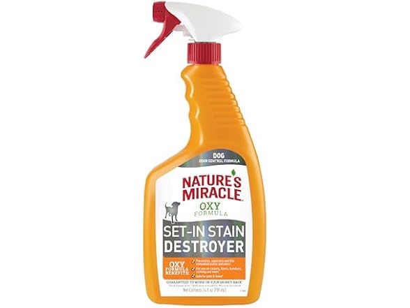 - (1) Nature’s Miracle Set-In Stain Destroyer For Dog Messes, 24 Ounces, Oxy Formula With Orange Scent