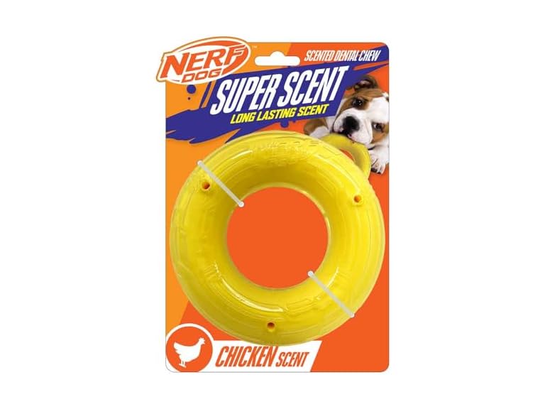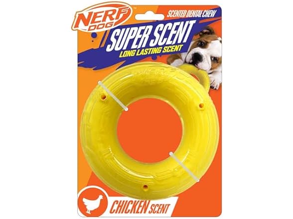 - (1) Nerf Dog 6in TPR/PP Scented Chicken SuperScent Ring Solid Core -Clear/Yellow