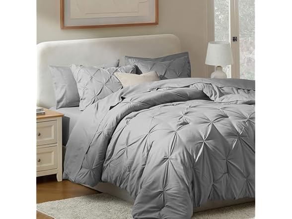 - Pinch Pleat Cal King Comforter Set: The all-season fluffy comforter and pillow shams are designed with pinch pleats for a pintuck style that looks effortlessly elegant. The fitted sheet includes elastic all the way around, so it stays in place all night long.