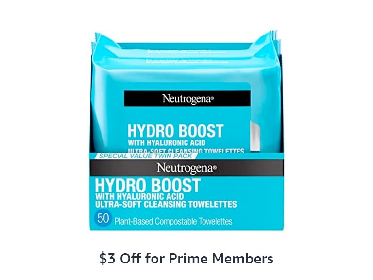 - Twin-pack of 25-count Neutrogena Hydro Boost Facial Cleansing Wipes made with hyaluronic acid and a micellar-infused, triple emollient gently cleanse skin and remove makeup while providing a boost of hydration and moisture
