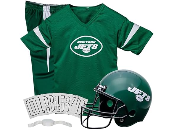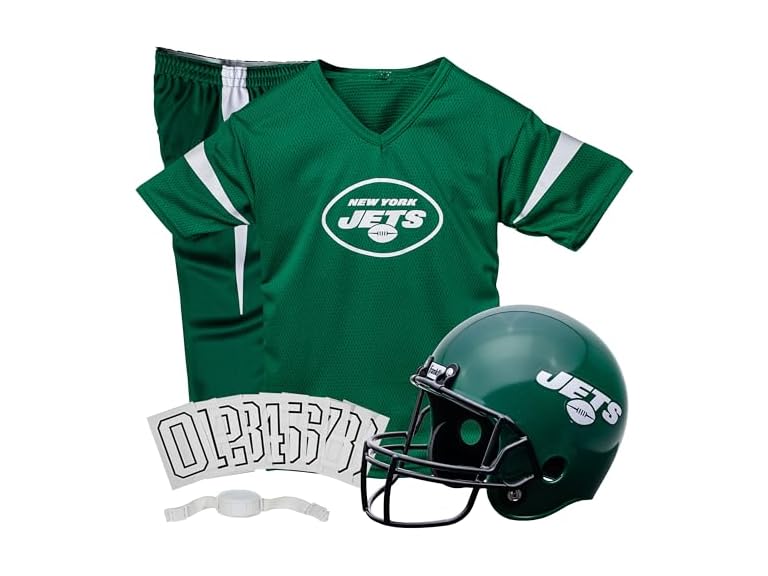 - (1) Franklin Sports New York Jets Kids Football Uniform Set - NFL Youth Football Costume for Boys & Girls - Set Includes Helmet, Jersey & Pants - Large