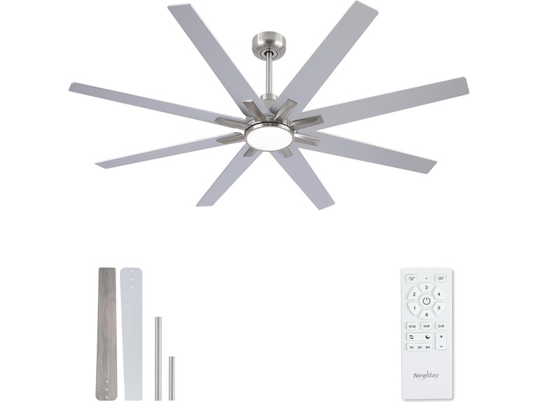 - Brushed Nickel Ceiling Fan: Silver 8 blade ceiling fan have bi-color blades. The colors of the two sides of the fan blades are different, you can choose according to your needs. Silver blades suitable for many home style, and the wood grain color is suitable for classic. Different rooms can have different styles of ceiling fans, giving you a variety of options. Product Dimensions: 62 inches*62 inches*13/19in inches. (2 Downrod Options)