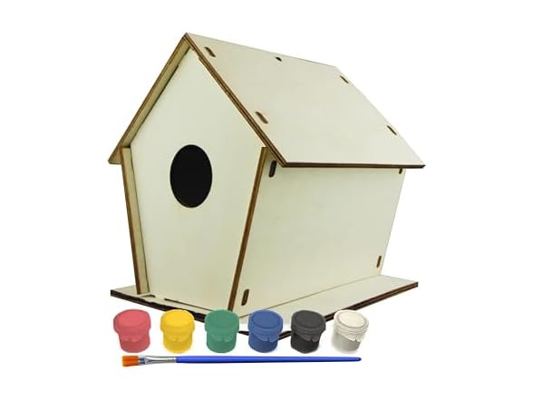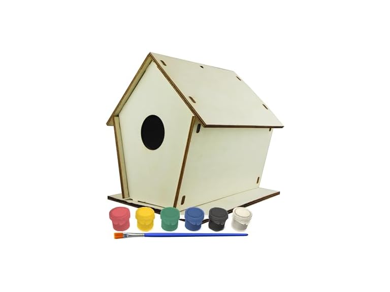 - ALL-IN-ONE CRAFT KIT: This DIY birdhouse kit has everything you need to build it. It includes seven wooden birdhouse pieces, water-resistant acrylic paints, a paintbrush, and hanging string. No special tools are needed.